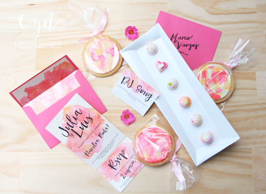 La tendencia actual en eventos incluye el uso de la técnica del acuarela tanto en papelería como en productos comestibles!