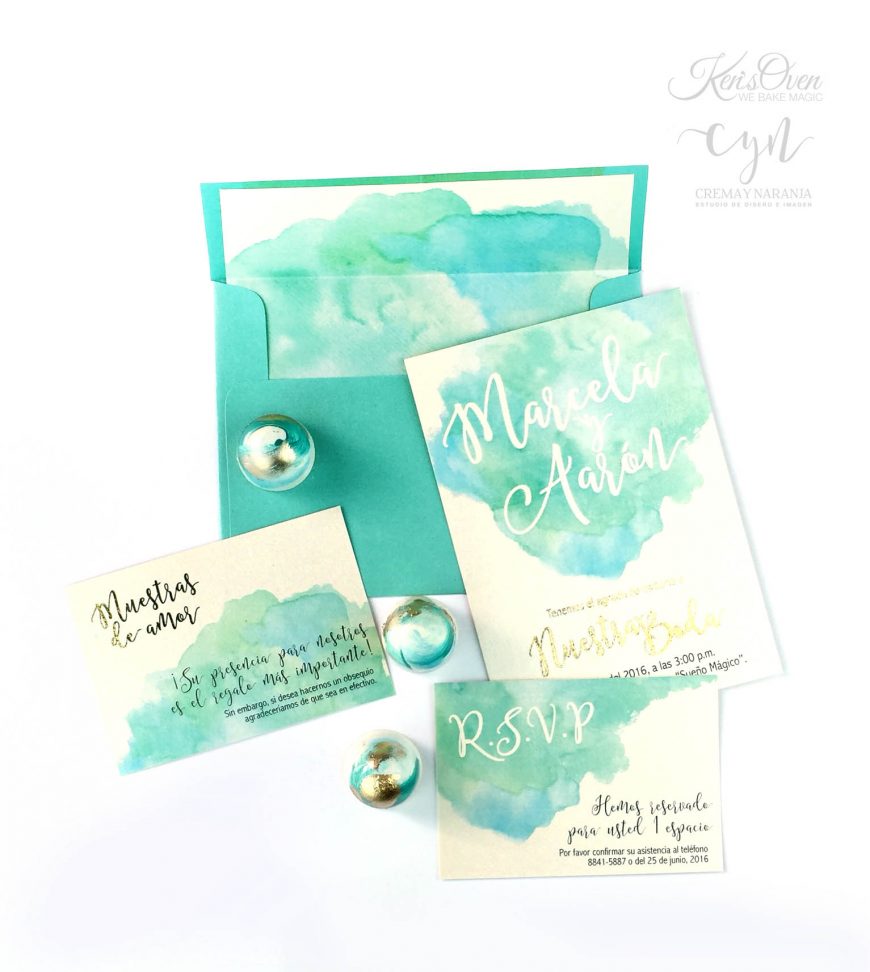 Las invitaciones que diseñamos, son pintadas a mano en papel para acuarela de 300 grs para que sea más resistente, pues teníamos que utilizar la técnica de húmedo sobre húmedo para crear esa aguada tan bella! Posteriormente digitalizamos el arte y le impregnamos nuestro sello personal laminando algunas palabras clave en dorado, además, seleccionamos como empaque de la invitacieon un sobre de lujo de color turquesa con solapa impresa.