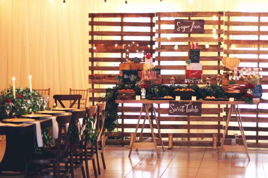 Dulces bellos y deliciosos. Diana armonizó su propuesta dulce con una pared de palets y bombillitos de feria; agregó a su diseño rótulos de madera y una mesa preciosa donde colocaría sus queques, mismos que se caracterizaron por un diseño contemporáneo enfocado en el concepto del montaje, hojitas doradas pintadas a mano (yo la vi pintarlas :D) y con detalles rústicos, sumamente delicados y hermosos. Dos de esos queques los trabajó empleando la técnica wood crackle effect y como si fuera poco moldeó una hermosa flor de azúcar color marsala. Inconcientemente Diana me complació con un naked cake, al que le colocamos un cake topper dorado. Amo los naked cake!!!